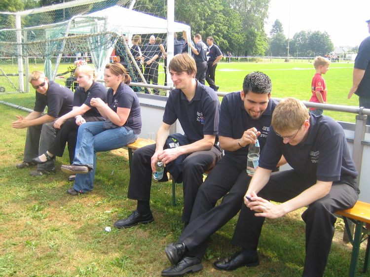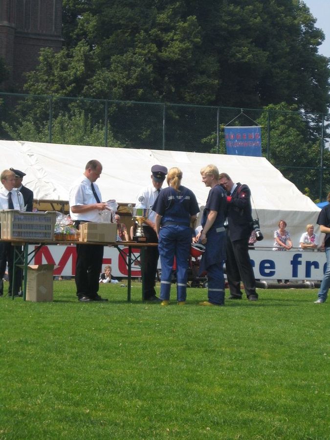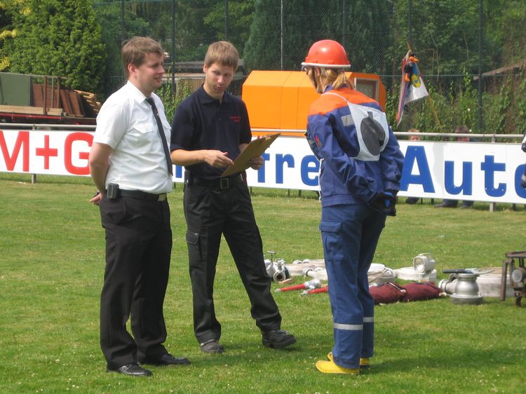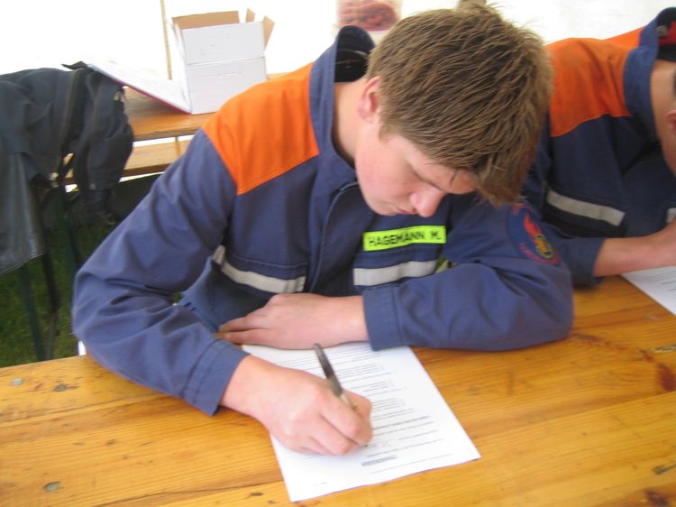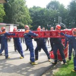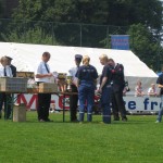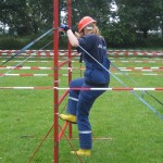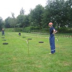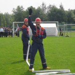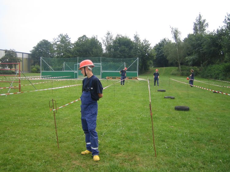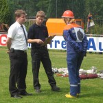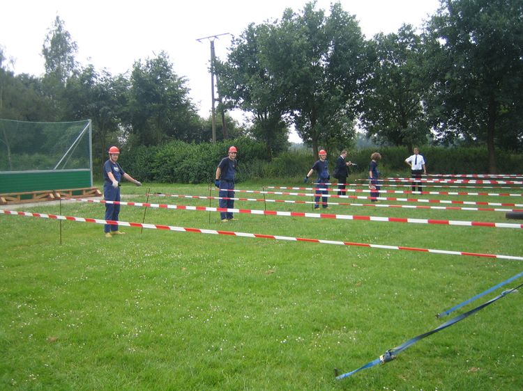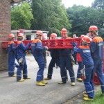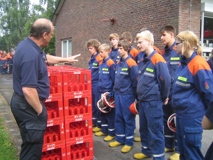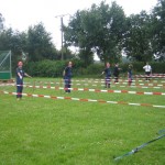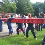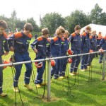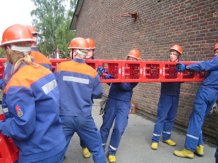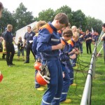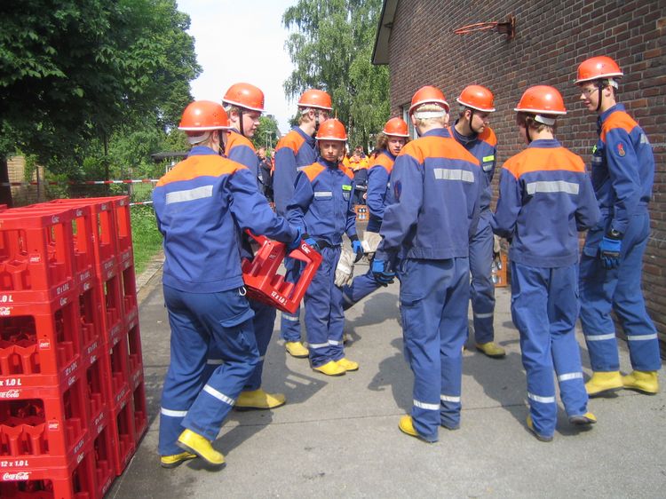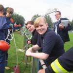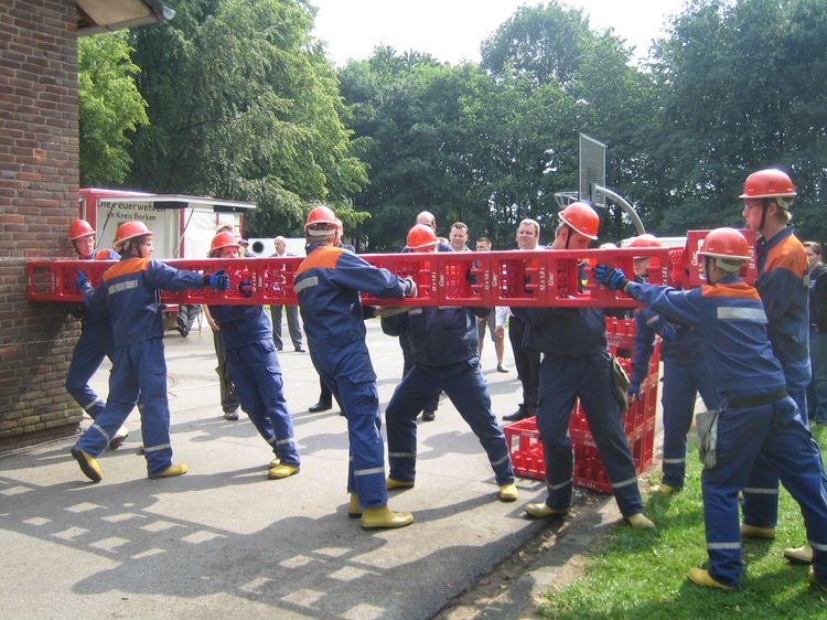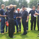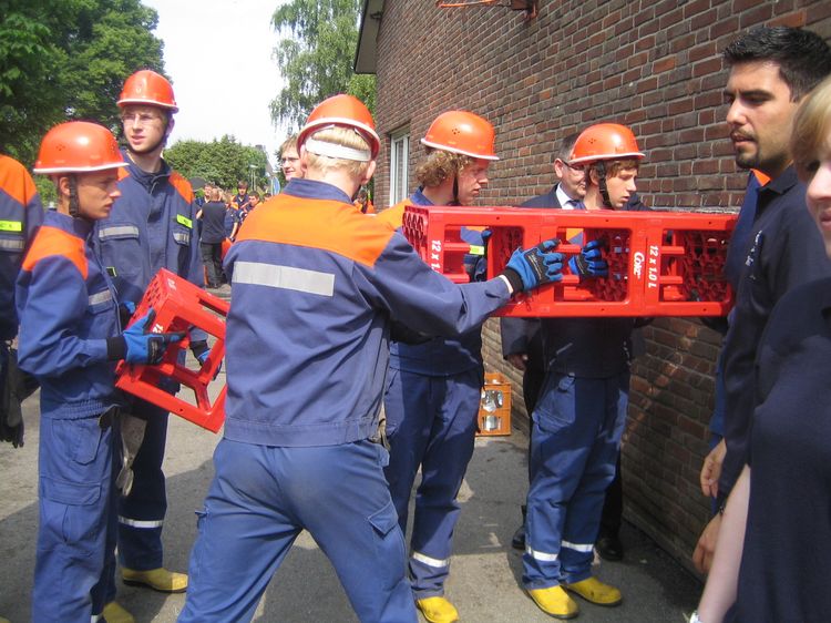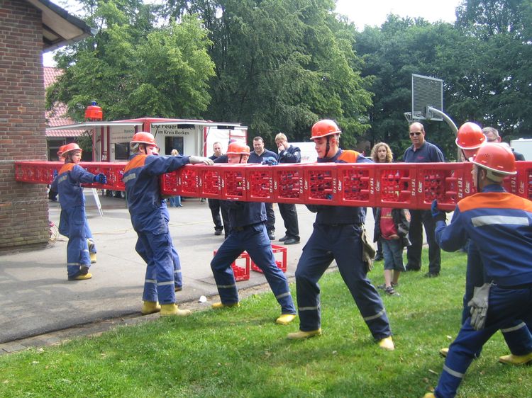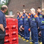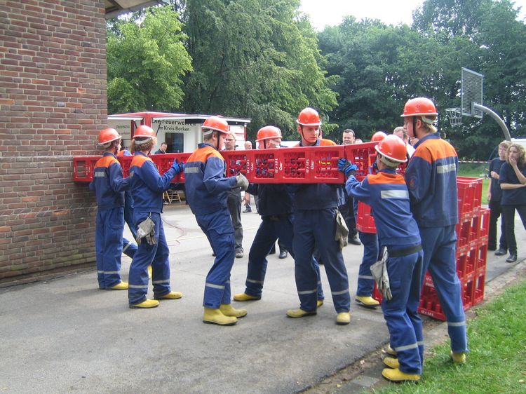 Für die Jugendfeuerwehren gab es auch noch ein Geschicklichkeitsspiel. Dieses Spiel organisiert die gastgebende Wehr, ohne dass die Teilnehmer über die Aufgaben vorher informiert werden. Diesmal mussten die Jugendfeuerwehr-Gruppen Getränkekisten stapeln. Aber nicht übereinander, sondern waagerecht von einer Wand weg. Die erste Kiste musste ungefähr einen Meter über den Boden gegen eine Wand gepresst werden, dann wurde die zweite Kiste angelegt, dann die dritte und so weiter. Die Gruppe, die die meisten Kisten an die Wand presste erhielt den Kreiswanderpokal, der seinerzeit noch von Landrat Gerd Wiesmann gestiftet wurde.