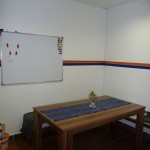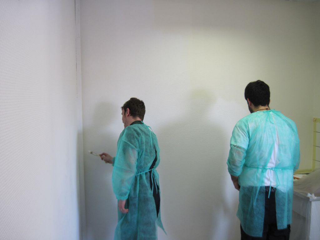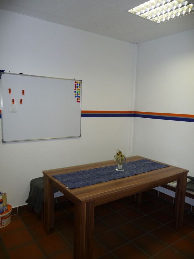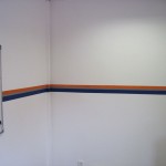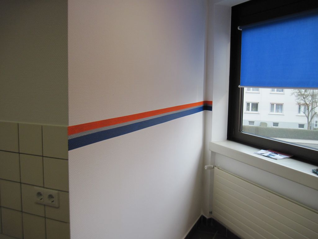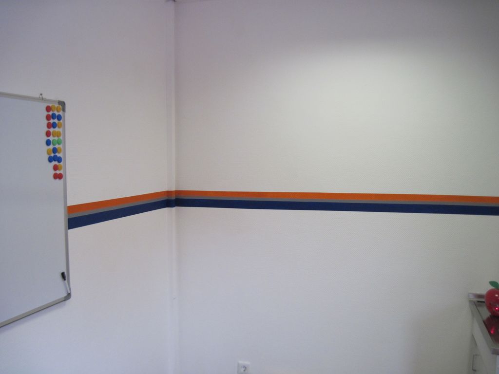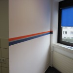 Der Umbau der Teeküch zum JF-Büro schreitet voran. Der Raum wurde entrümpelt und die Wandflächen sind neu gestrichen und mit einer Bordüre in JF-Farben (Orange – silber – blau) versehen.