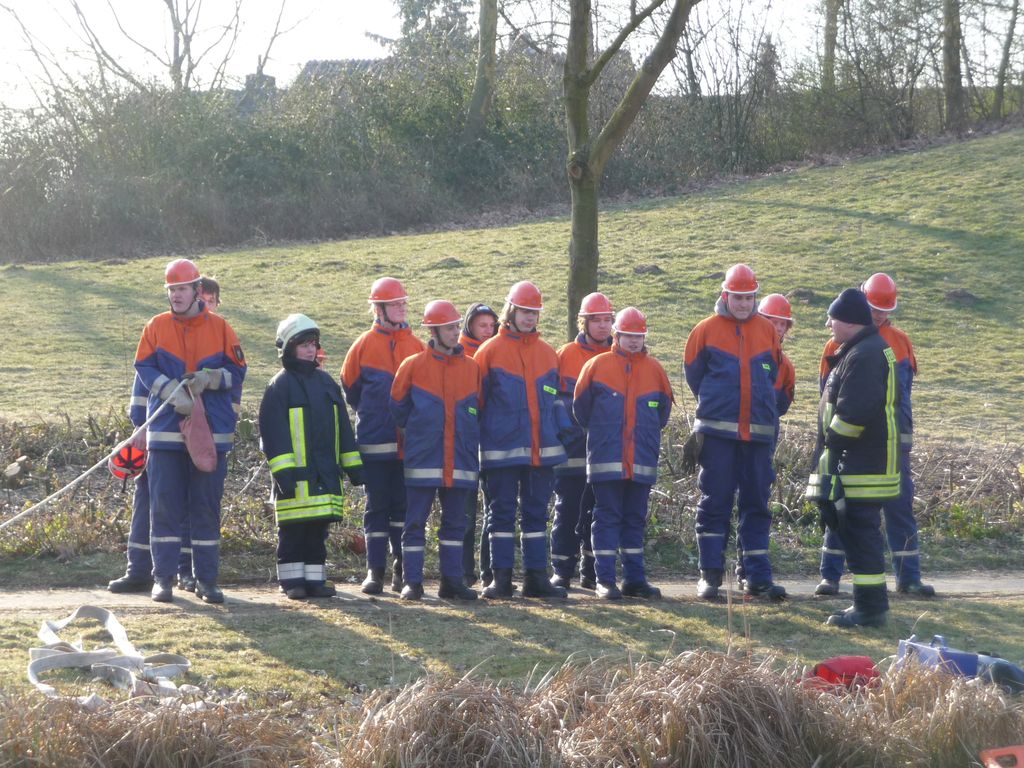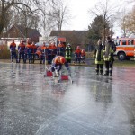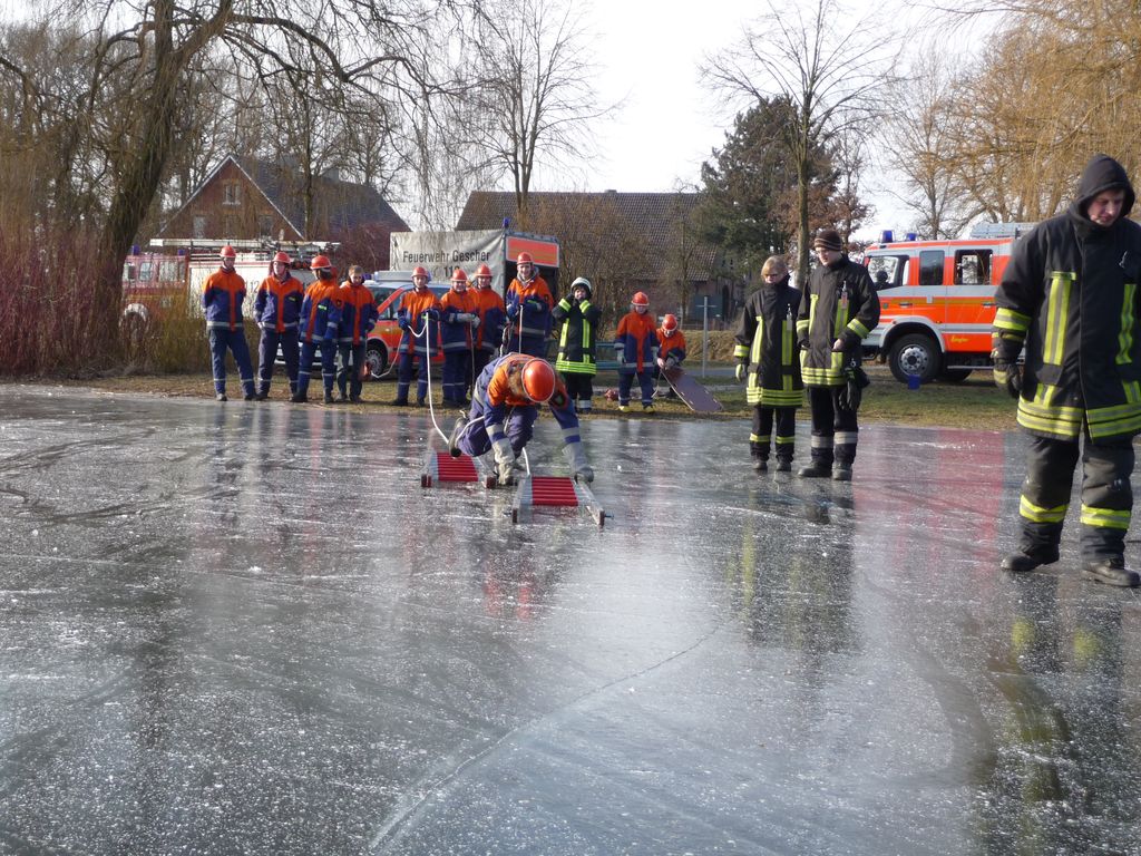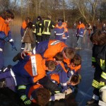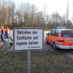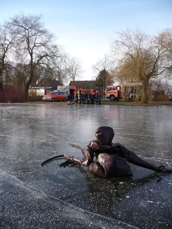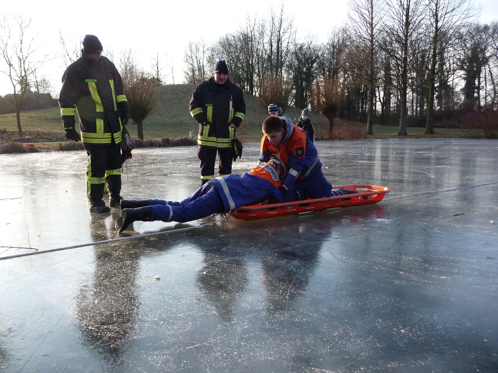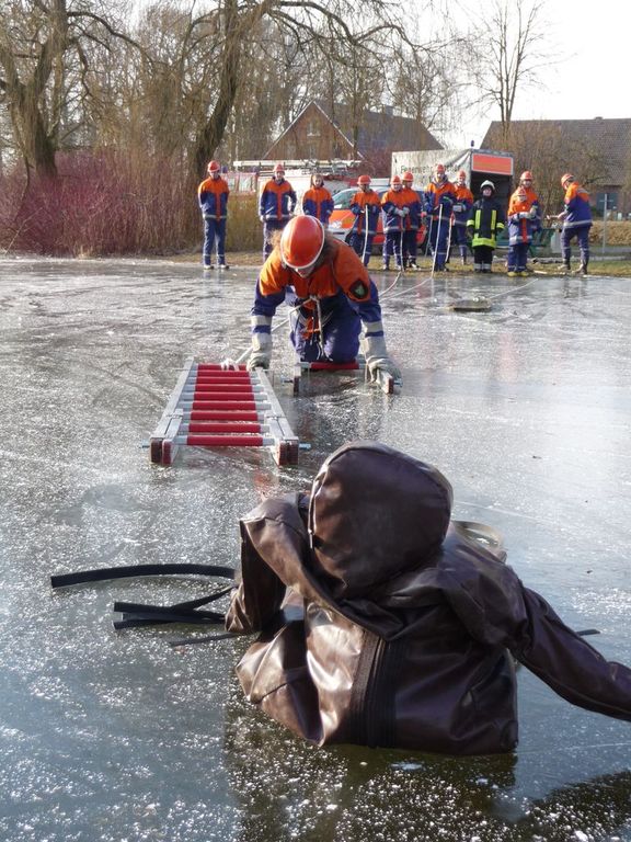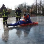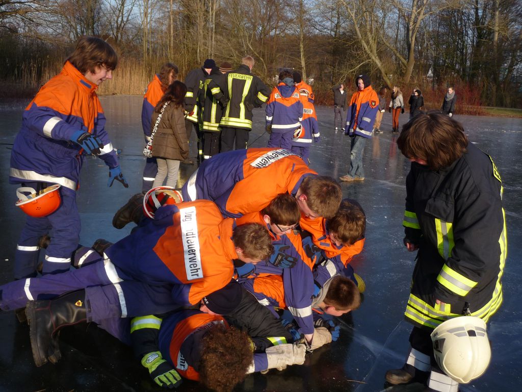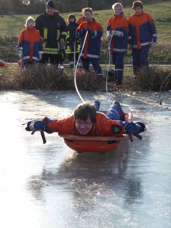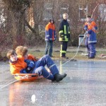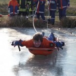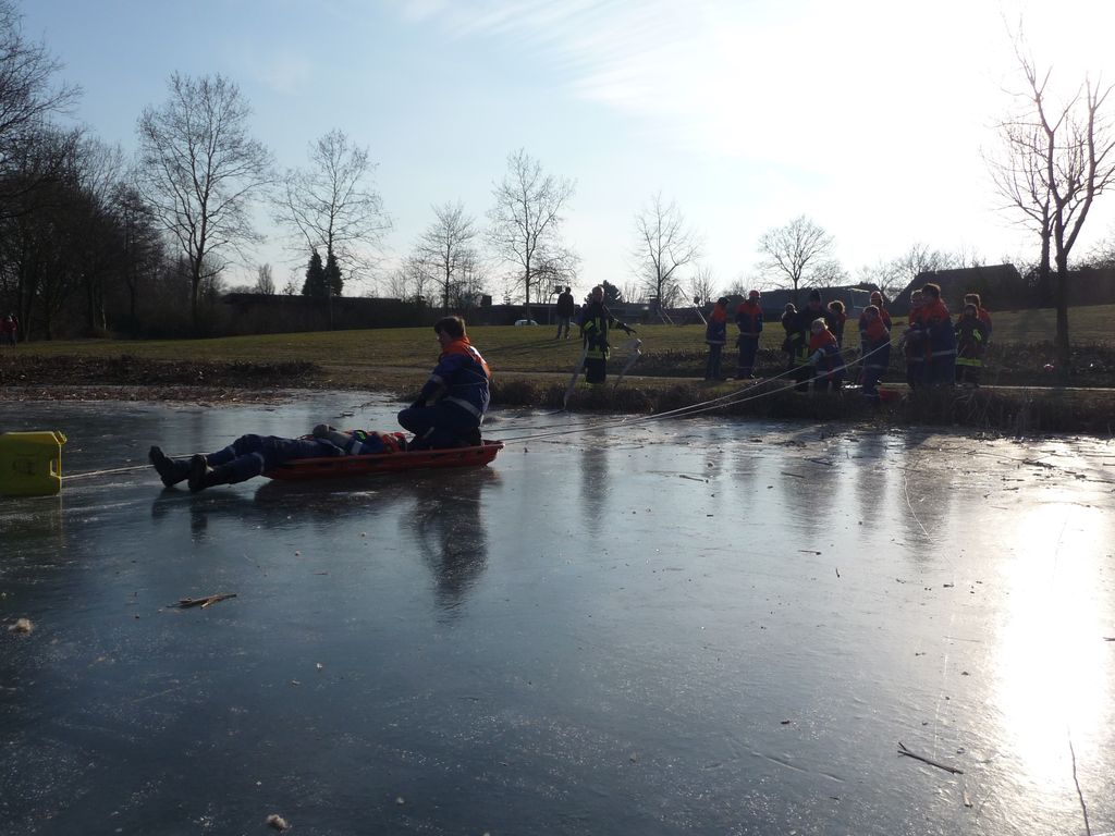 Wie schon bei der Dienstplangestaltung vor 2 Monaten vorhergesehen, konnten wir am vergangenen Montag plangemäß unsere Eisrettungsübung machen. Die gemessene Eisdicke betrug knapp 16 cm. Somit konnte es auf dem Rodelbergteich zur Rettung losgehen. An 2 Stationen wurden verschiedene Methoden vorgestellt, sowohl per Steckleiterteile, wie auch mit Schleifkorbtrage und schnelle Massnahmen wie Feuerwehrleine oder auch C-Schlauch. Auch die Informationen zur Ersten Hilfe durften nicht fehlen. Besondere Hinweise wurden zudem noch für eine mögliche Rettung wenn man mal nicht als Feuerwehr unterwegs ist und als Ersthelfer einspringen muss gegeben.