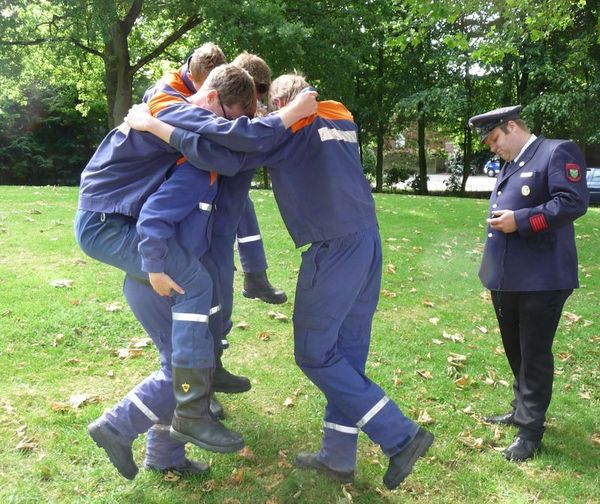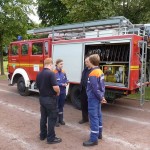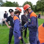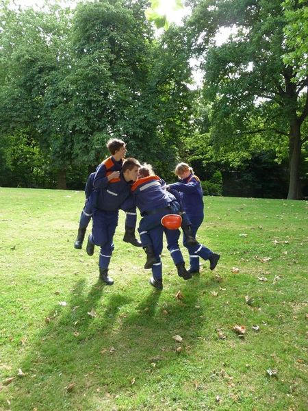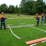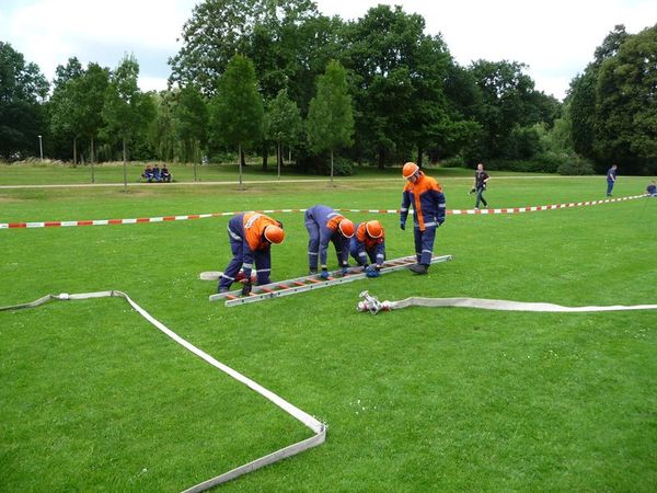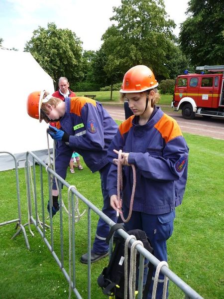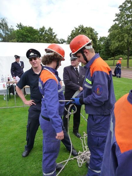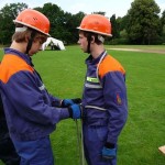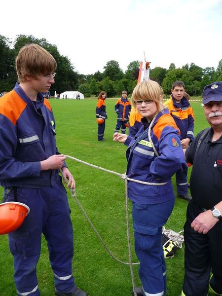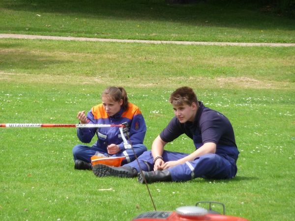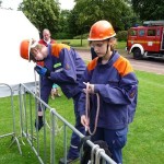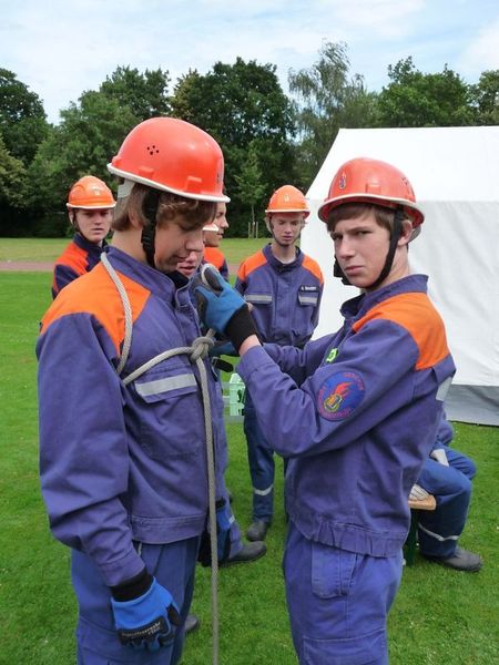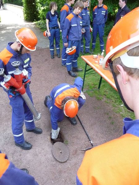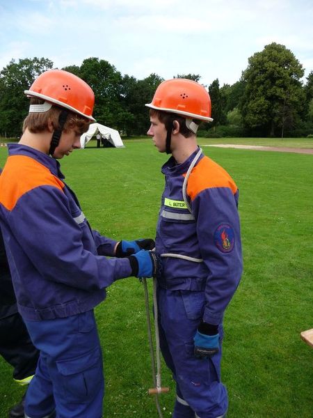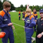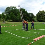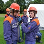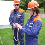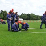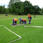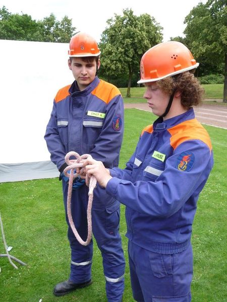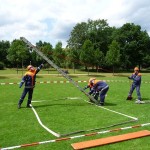 So mußte für die Stufe 2 z.B. ein Buchstabe gezogen werden, um dann auf einem Feuerwehrfahrzeug ein Gerät mit diesem Anfangsbuchstaben zu finden und zu erklären. Aus einer Auswahl von verschiedenen Knoten wurden dann pro Person der Rettungsknoten sowie zwei direkt vorher gezogene Knoten gestochen oder gelegt. An weiteren Station mußte ein Unterflurhydrant gesetzt werden und ein provisorischer Wasserwerfer aufgebaut werden. Teamarbeit war aber auch gefragt. So mußten die JFler mit 5 Personen sich auf Zeit so zusammenfinden, dass die gesamte Gruppe auf 3 Beinen steht und sich alle berühren.