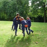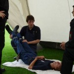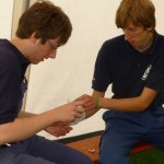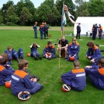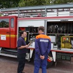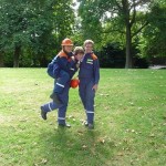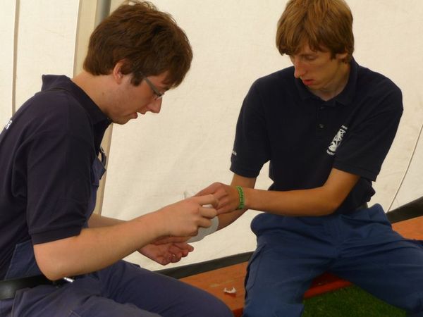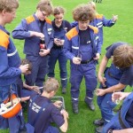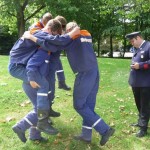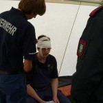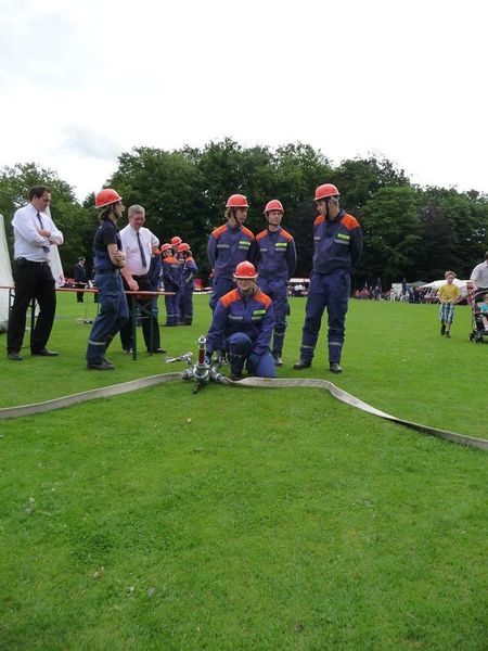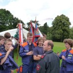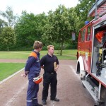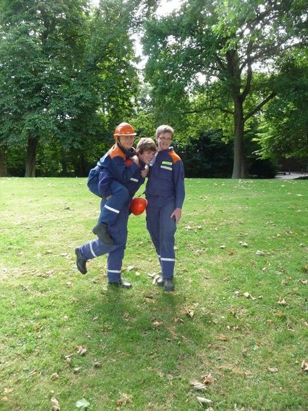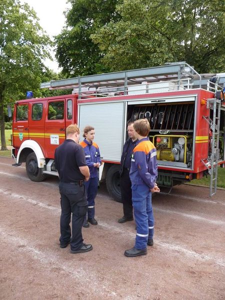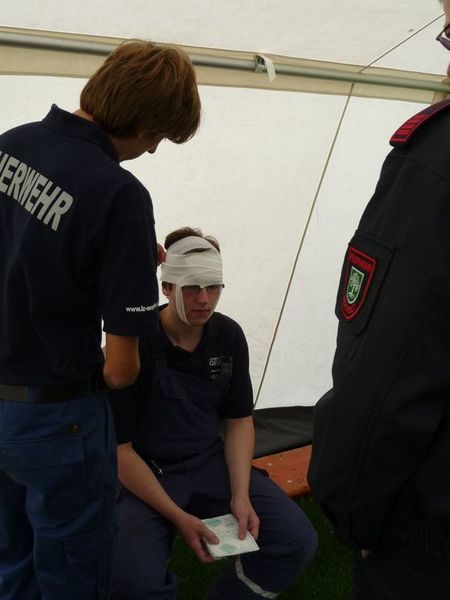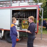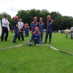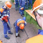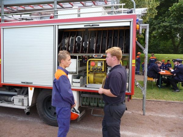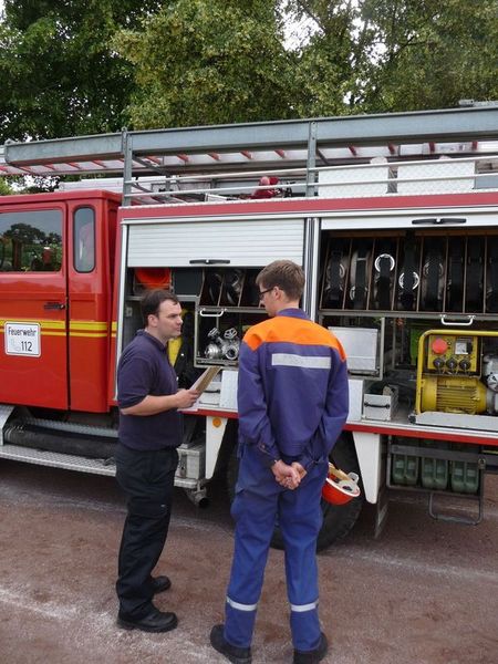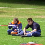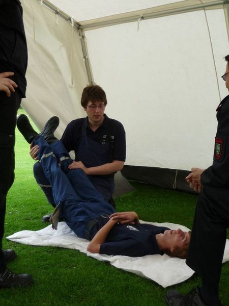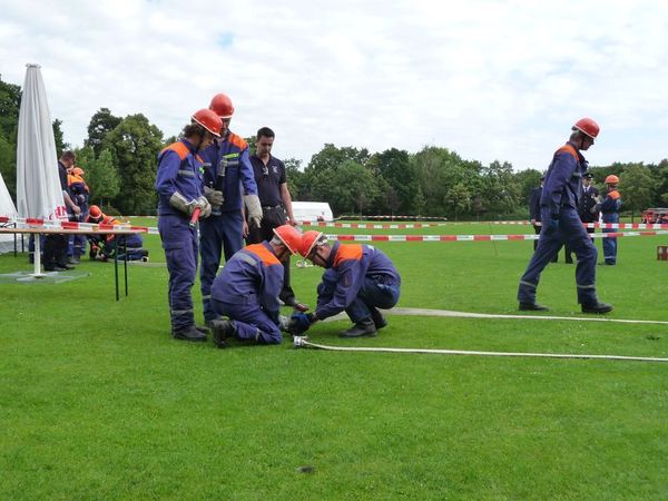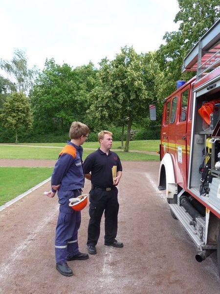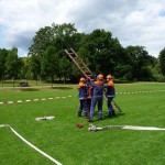 So mußte für die Stufe 2 z.B. ein Buchstabe gezogen werden, um dann auf einem Feuerwehrfahrzeug ein Gerät mit diesem Anfangsbuchstaben zu finden und zu erklären. Aus einer Auswahl von verschiedenen Knoten wurden dann pro Person der Rettungsknoten sowie zwei direkt vorher gezogene Knoten gestochen oder gelegt. An weiteren Station mußte ein Unterflurhydrant gesetzt werden und ein provisorischer Wasserwerfer aufgebaut werden. Teamarbeit war aber auch gefragt. So mußten die JFler mit 5 Personen sich auf Zeit so zusammenfinden, dass die gesamte Gruppe auf 3 Beinen steht und sich alle berühren.