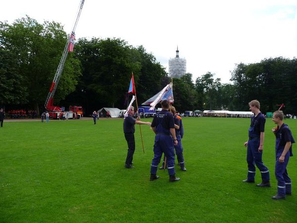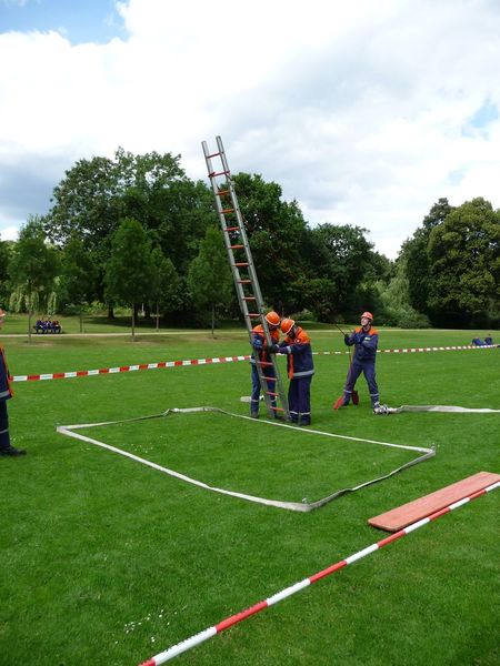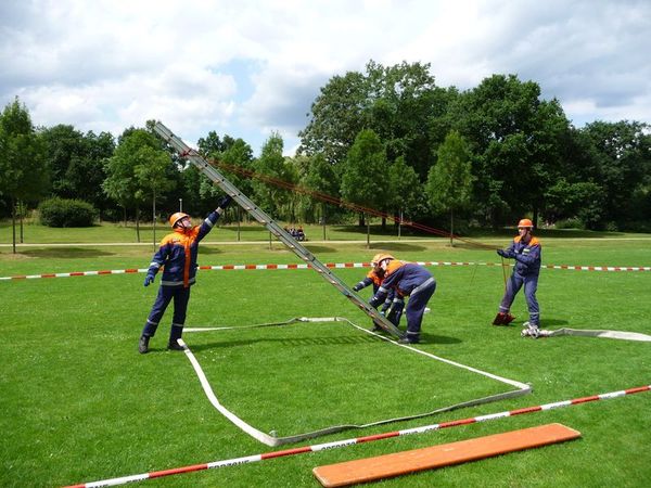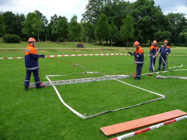 In der Stufe 3 mußte ein Schaumangriff sowie eine Löschangriff über ein gedachten Graben mit Hilfe von Leiterteilen errichtet werden. Die Lösung der Aufgaben waren dann im Team zu entwickeln und zu lösen. Die Teams bestanden dazu auch noch aus Mitgleidern aus verschiedenen Jugendfeuerwehren, die noch nie vorher zusammen geübt haben.Desweiteren waren Kenntnisse in der ersten Hilfe gefragt. Neben dem benötigten Erste Hilfe-Schein wurde die stabile Seitenlage, die Schocklage, ein Kopf und ein Daumenverband abgefragt. Im Vorfeld vor der Veranstaltung musste zudem schon ein Nachweis erbracht werden, dass sich der Teilnehmer an einem sozialem/ökologischem Projekt beteiligt haben. Dies wurde in Gescher durch die mittlerweile über 5 jährige Unterstützung der Tafel sowie der Mithilfe im NSG Kuhlenvenn nachgewiesen.