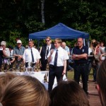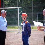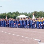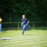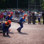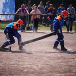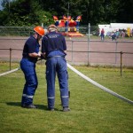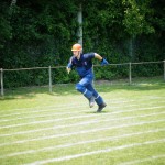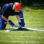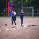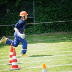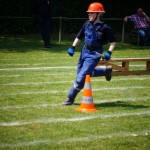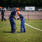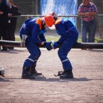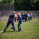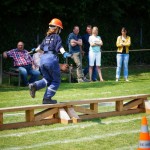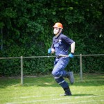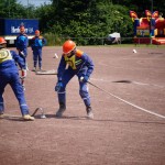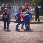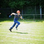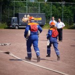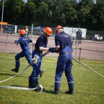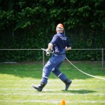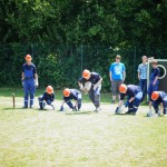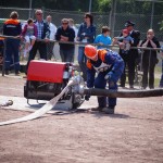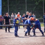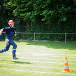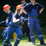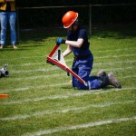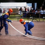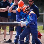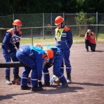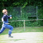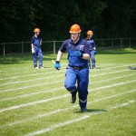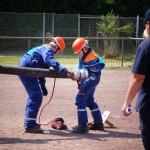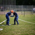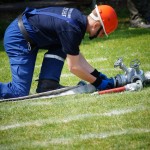 Als nächstes folgte der Löschangriff, bei dem eine Wasserentnahme aus offenem Gewässer mit der Vornahme von 3 C-Rohren, auf Richtigkeit und Schnelligkeit aufgebaut werden musste. Nach der Mittagspause musste dann noch ein Staffellauf mit verschiedenen Aufgaben wie Schwebebalken, Slalom, Warndreieckaufbauen, Schlauch ausrollen und einem Leinenbeutelzielwurf absolviert werden. Zuletzt ging es dann noch einmal um die Schnelligkeit. Es mussten 5 C-Schläuche mit jeweils 15 m Länge auf Zeit ausgerollt, zusammengekuppelt und ohne Drall verlegt werden.