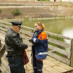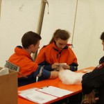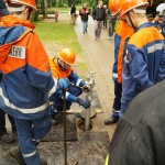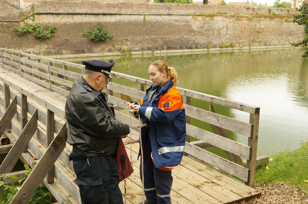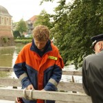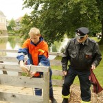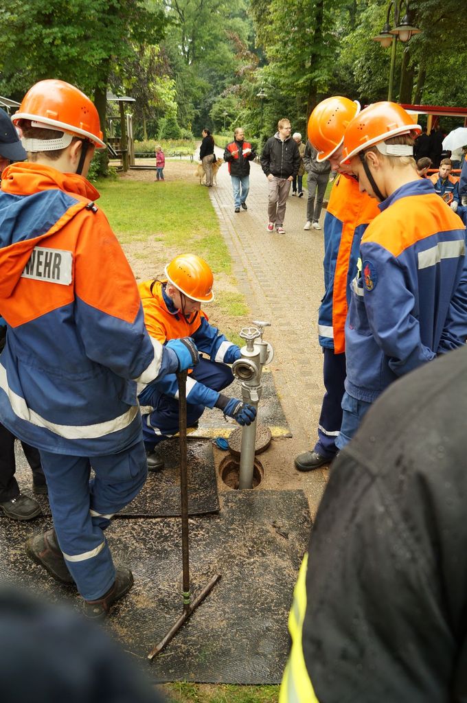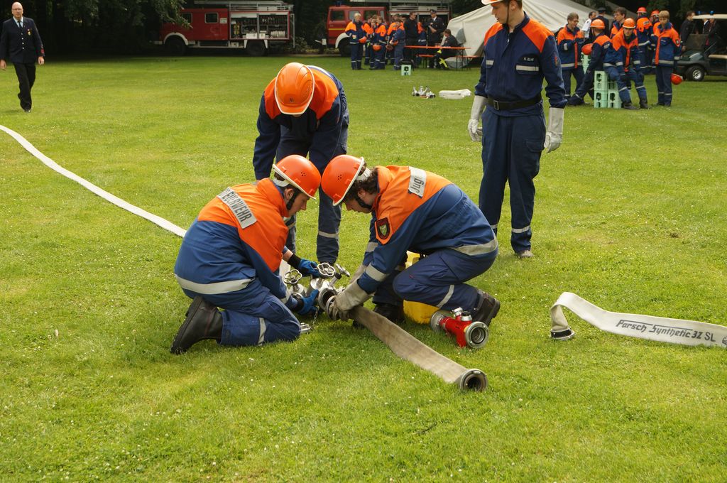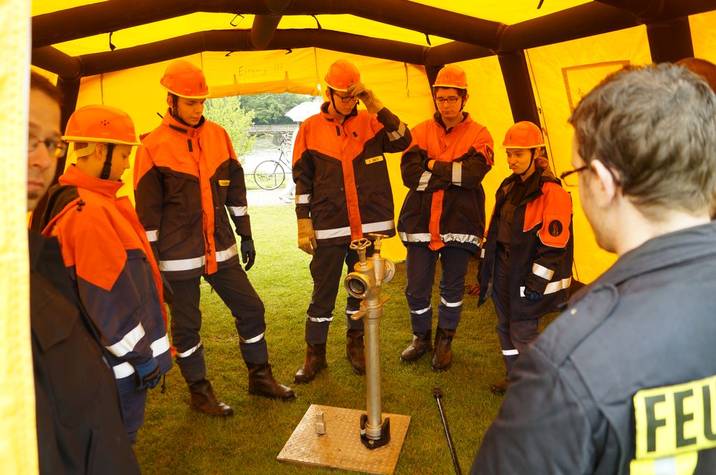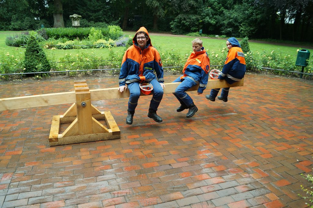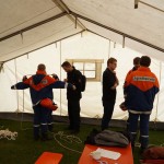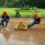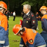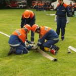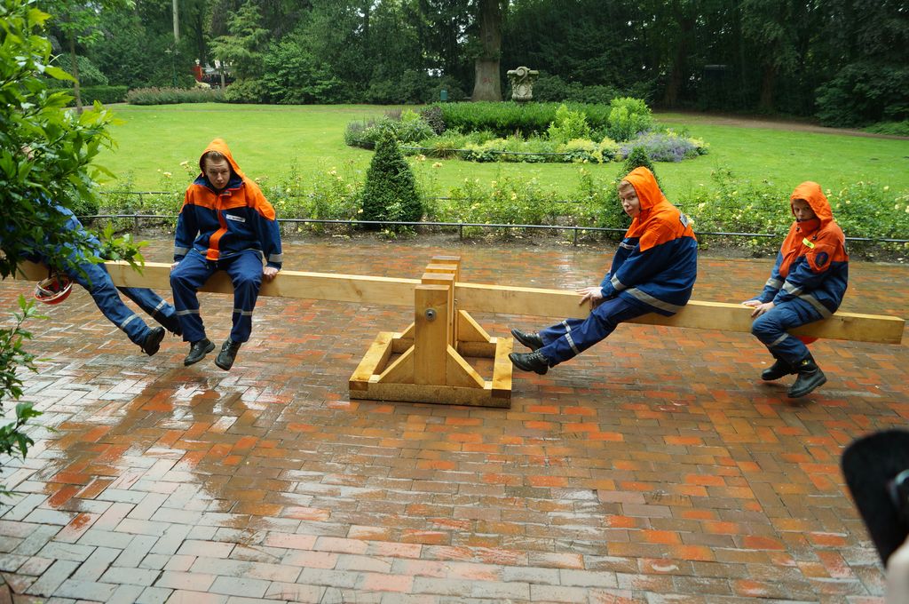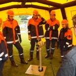 So mußten für die Stufe 2 ein provisorischer Wasserwerfer aufgebaut werden, Kenntnisse in Fahrzeugbeladung, Feuerwehrknoten und der Wasserentnahme aus Hydranten gezeigt werden. Ein sportliche Aufgabe, bei der man sich mit 5 Personen so auf einer Wippe verteilen mußte, dass sich keine Füße mehr auf dem Boden befanden, rundete die Abnahme ab.