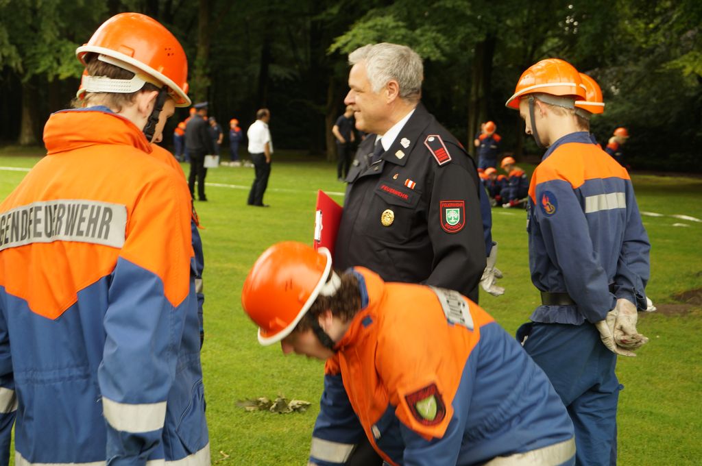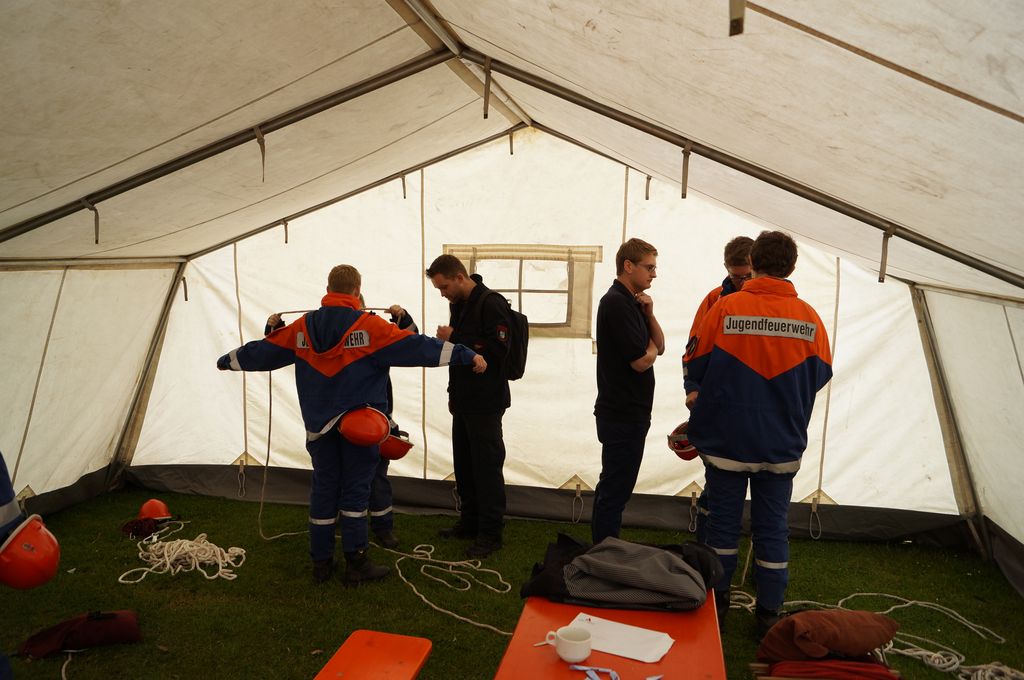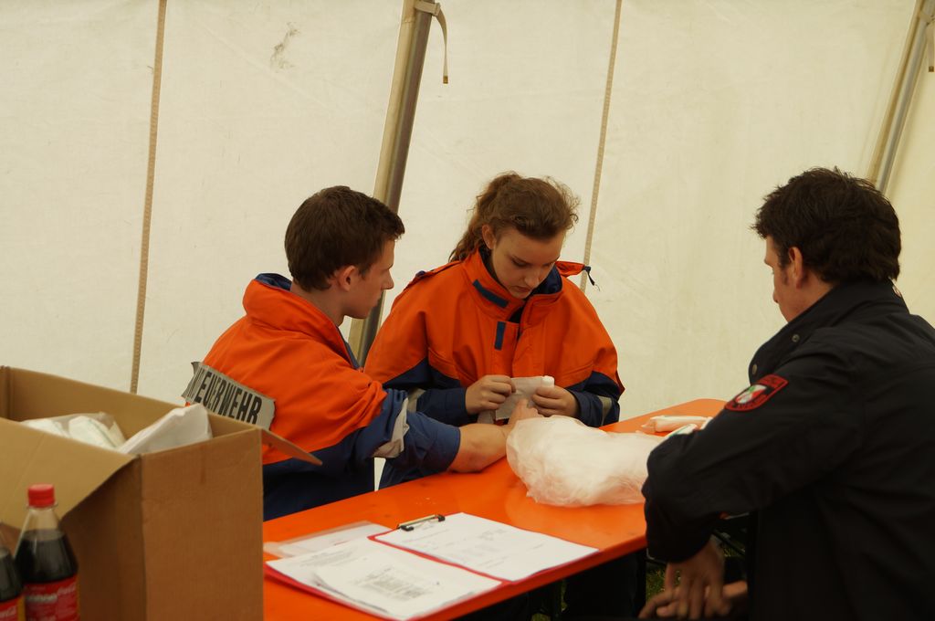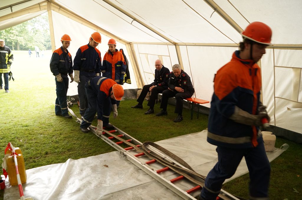 Leider sorgten starke Regenfälle dafür, dass einige Stationen umorganisiert werden mussten. So wurden Aufgaben anstatt im Freien in Zelte und Fahrzeuge verlegt. Am Ende konnte der Kreisjugendfeuerwehrwart Ralf Gottlob bei trockenem Wetter verkünden, dass alle angetretenen Jugendlichen die jeweilige Stufe bestanden haben, so dass die Abzeichen verteilt werden konnten.