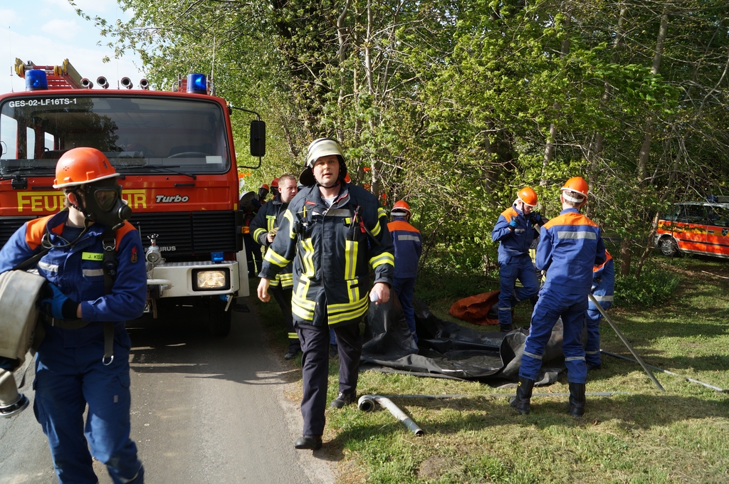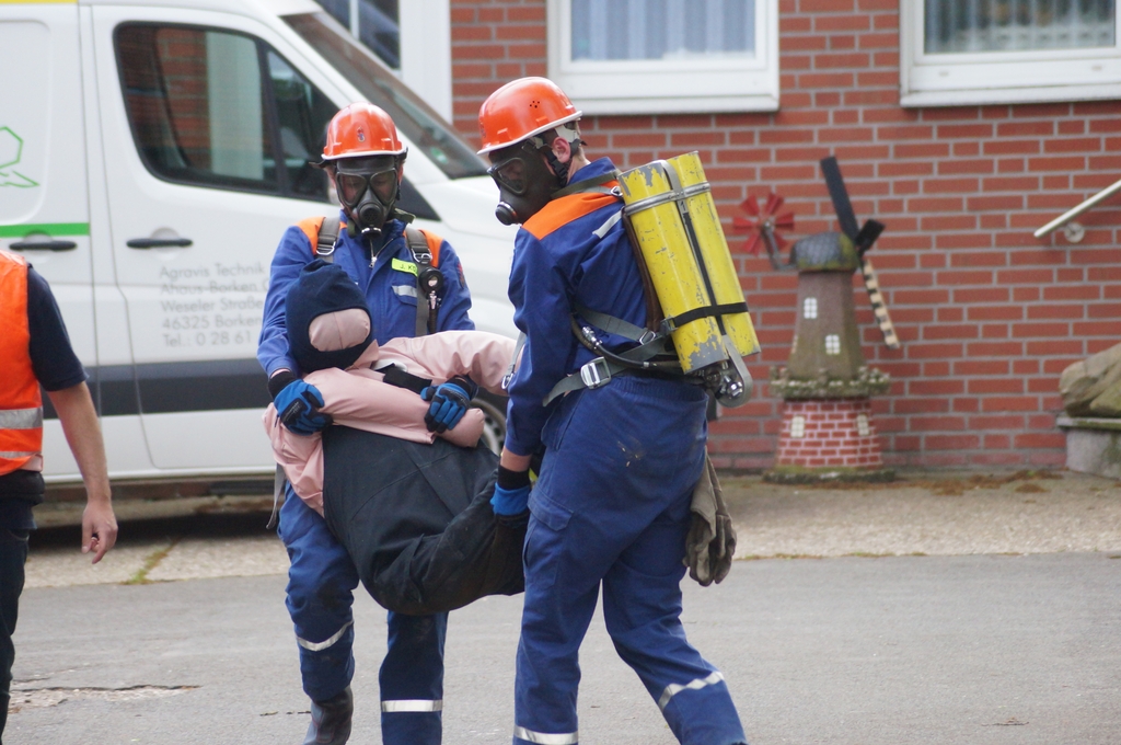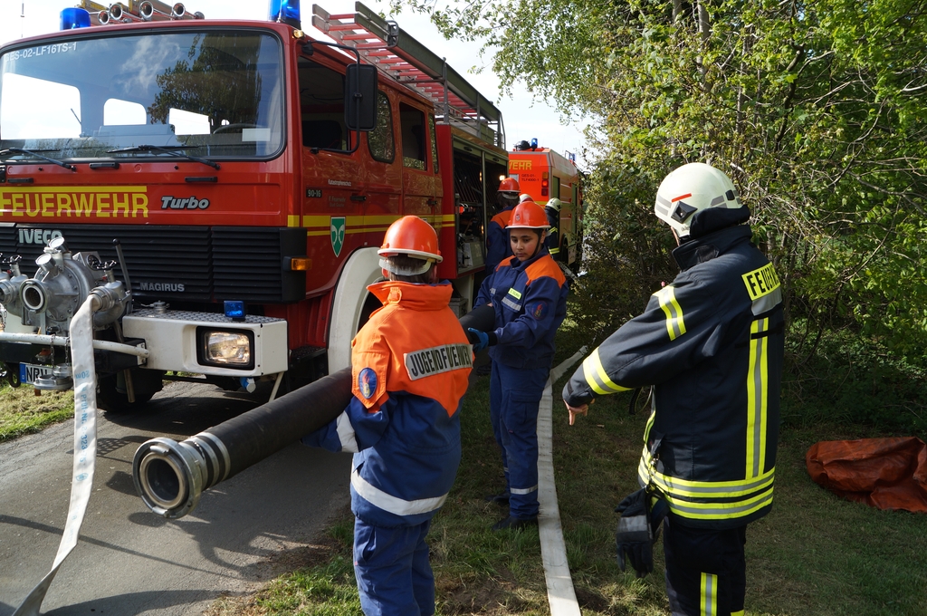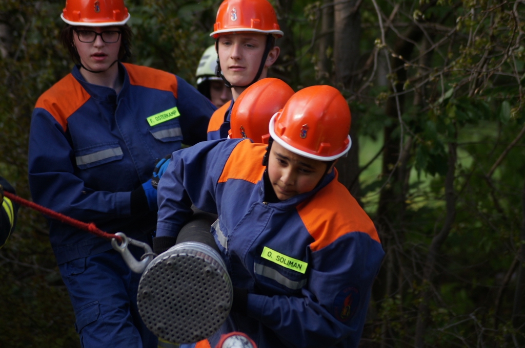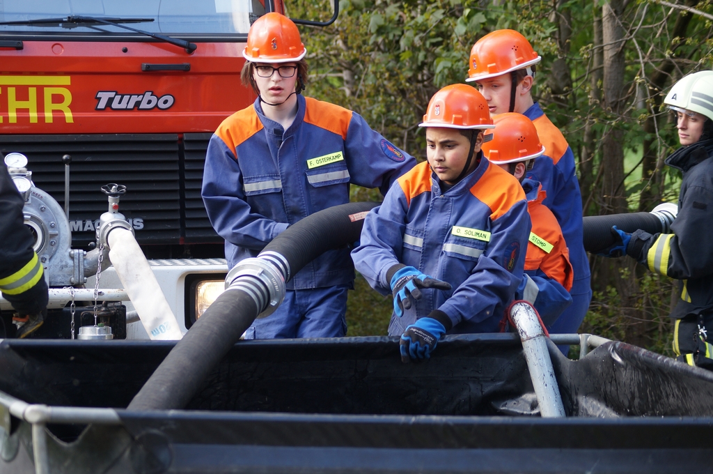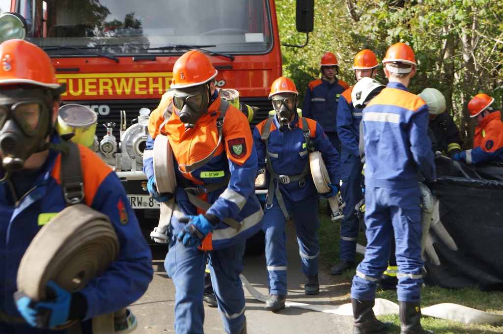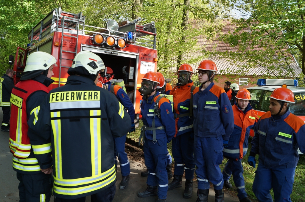 Die Jugendfeuerwehr Velen hatte am vergangenen Wochenende einen sogenannten BF-Tag (einen Tag an dem die Jugendfeuerwehr eine Schicht einer Berufsfeuerwehr nachspielt und auch zu Übungseinsätzen alarmiert wird). Einer dieser Übungseinsätze war auf dem Hof Hagmann in Nordvelen. Da hier nur begrenzt Wasser zur Verfügung steht wurde die Jugendfeuerwehr Gescher in diese Übung mit eingeplant. Im Vorfeld wussten nur die Jugendwarte in Gescher über diese Übung Bescheid, und überraschten die Jugendlichen mit einer „Alarmierung“ über eine Instant Messaging App zu einem Einsatz. Dabei wurde entsprechend genügend Zeit gegeben, so dass die Jugendlichen sicher zum Gerätehaus kommen konnten. Spontan fanden genügend Jugendliche Zeit und konnten so die Fahrzeuge komplett besetzen. Vor Ort stellte die Jugendfeuerwehr Gescher die Wasserversorgung über einen Wassersack und einem Pendelverkehr mit einem TLF sicher. Zeitgleich wurden in einem Stall zwei Personen vermisst. Die Personensuche mit Atemschutzattrappen wurde sogleich durchgeführt und es konnten die vermissten Personen schnell gefunden werden. Die Jugendwarte waren anschließend mit der für die Jugendlichen überraschenden Zusammenarbeit beider Jugendfeuerwehren sehr zufrieden.