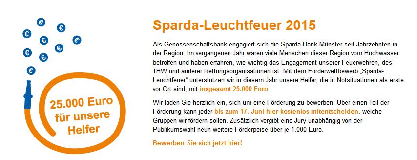 Gescher, 30.05.2015 Die Jugendfeuerwehr Gescher nimmt am Spendenwettbewerb „Sparda-Leuchtfeuer“ teil und braucht Publikumsstimmen! Mit insgesamt 25.000 Euro fördert die Sparda-Bank Münster eG Hilfs- und Rettungsgruppen zwischen Nordsee und Münsterland. Die Gruppen sind bei der Publikumswahl aufgefordert, Ihr Engagement zu präsentieren und das Onlinepublikum zu überzeugen.