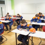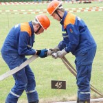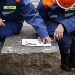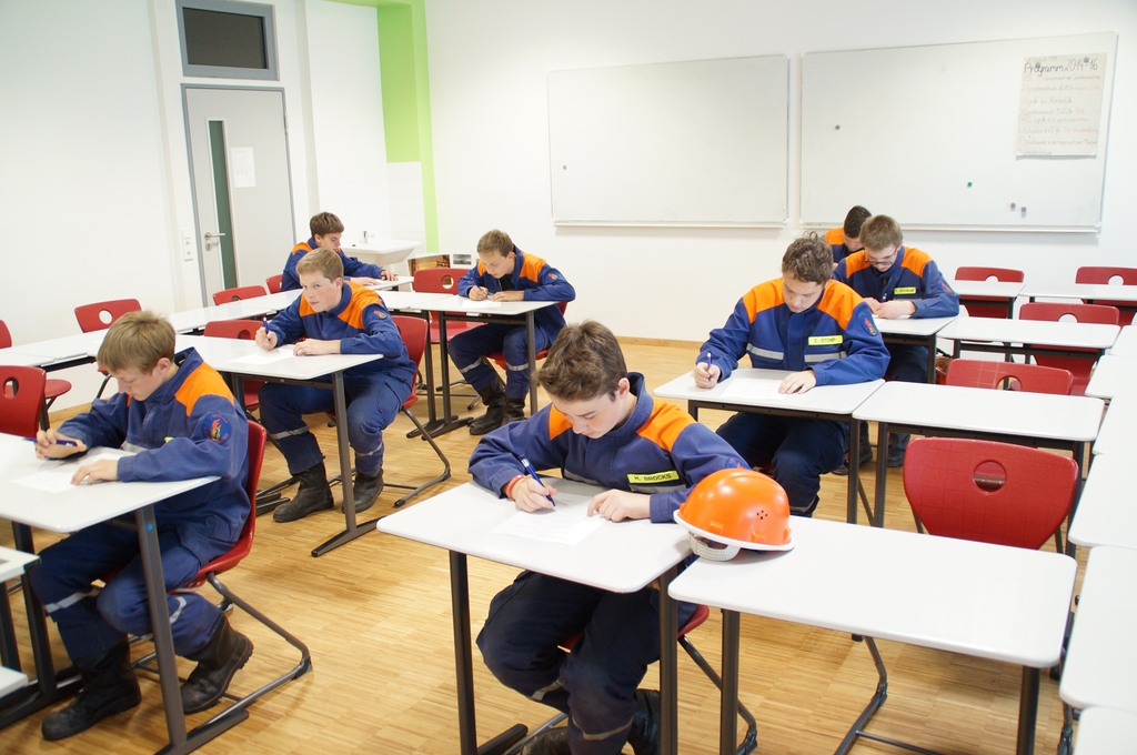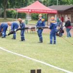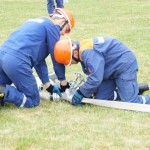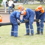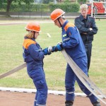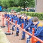 Bei der zweiten Station ging es darum, 5 C-Schläuche (jeweils 15 m Länge) auf Zeit ohne Verdrehung auszurollen und zusammen zu kuppeln. Anschließend ging es zum Theoretischen Teil. Hier musste jeder 15 Fragen aus dem Bereich der Feuerwehr, dem Allgemeinwissen und aktueller Ereignisse beantworten. Eine weitere Station war dann Knoten und Stiche bei denen der Mastwurf, der Zimmermannstich, der Schotensteg und der Rettungsknoten fehlerfrei geknotete werden mussten.