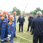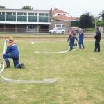Abschließend musste dann noch ein Löschangriff gezeigt werden. Dazu wird von der Gruppe eine Saugleitung aufgebaut und mit einer Wasserleitung von der Pumpe bis zu den drei Zielfeuern eine Brandbekämpfung aufgebaut. Dies alles musste möglichst fehlerfrei und auf Zeit durchgeführt werden. Der Löschangriff wird am nächsten Sonntag auch am Tag der offenen Tür der Feuerwehr Gescher gezeigt.