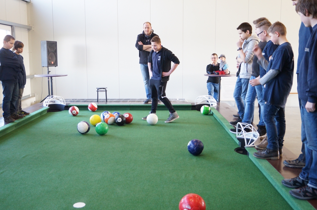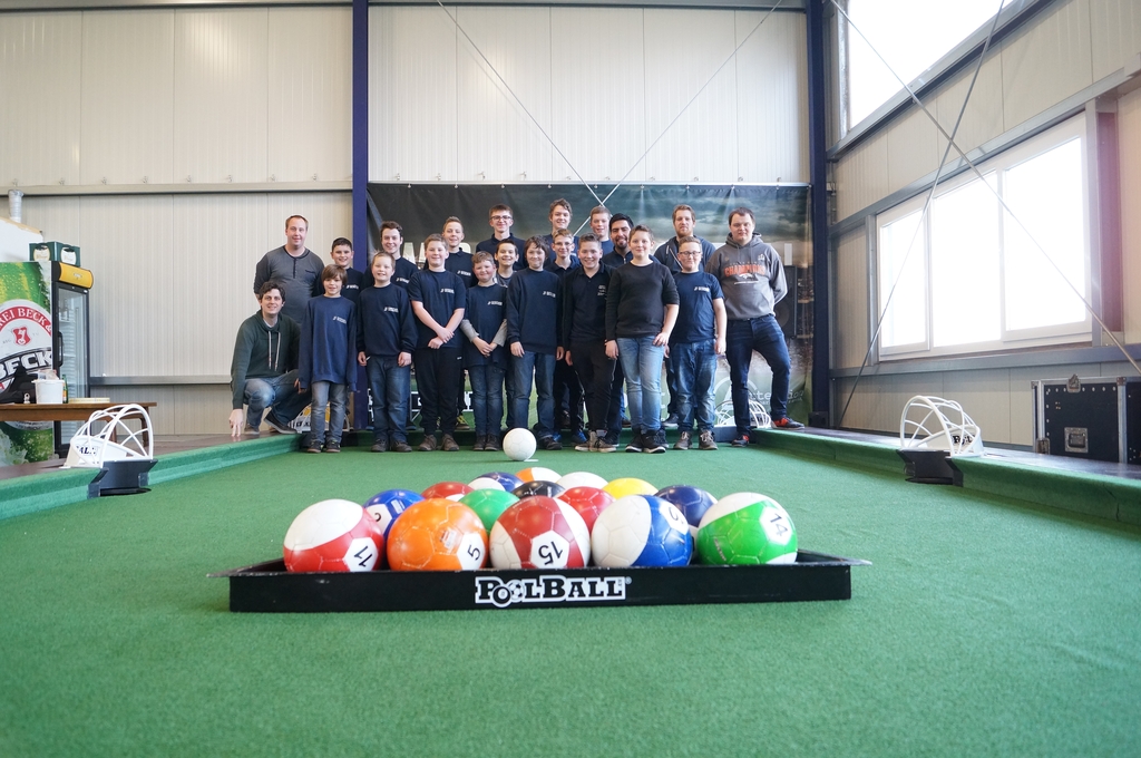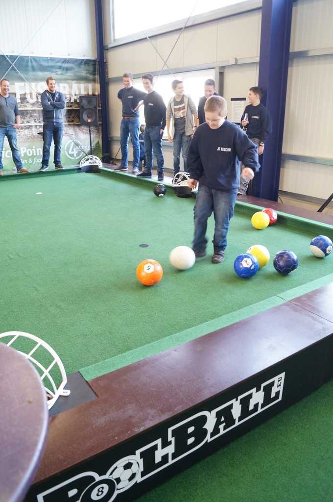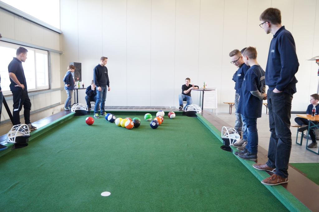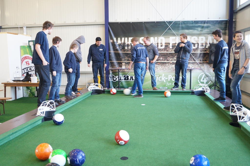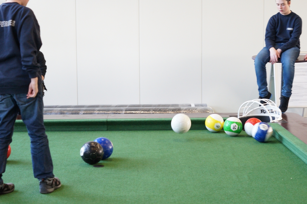 Beim letzten Dienstnachmittag stand der Spaß im Vordergrund. Ziel war ein sportlicher Wettkampf der besonderen Art in Reken, nämlich Poolball. Poolball ist im Prinzip Billard als Fußballspiel. Auch hier gilt es 8 Kugeln über eine weiße Kugel in eines von 6 Löchern zu versenken. Anstatt ein Qeue musste man aber die weiße Kugel mit dem Fuß spielen und die Kugeln an sich waren Fußbällen. Der Erfinder und Hersteller von Poolball kommt aus Reken.