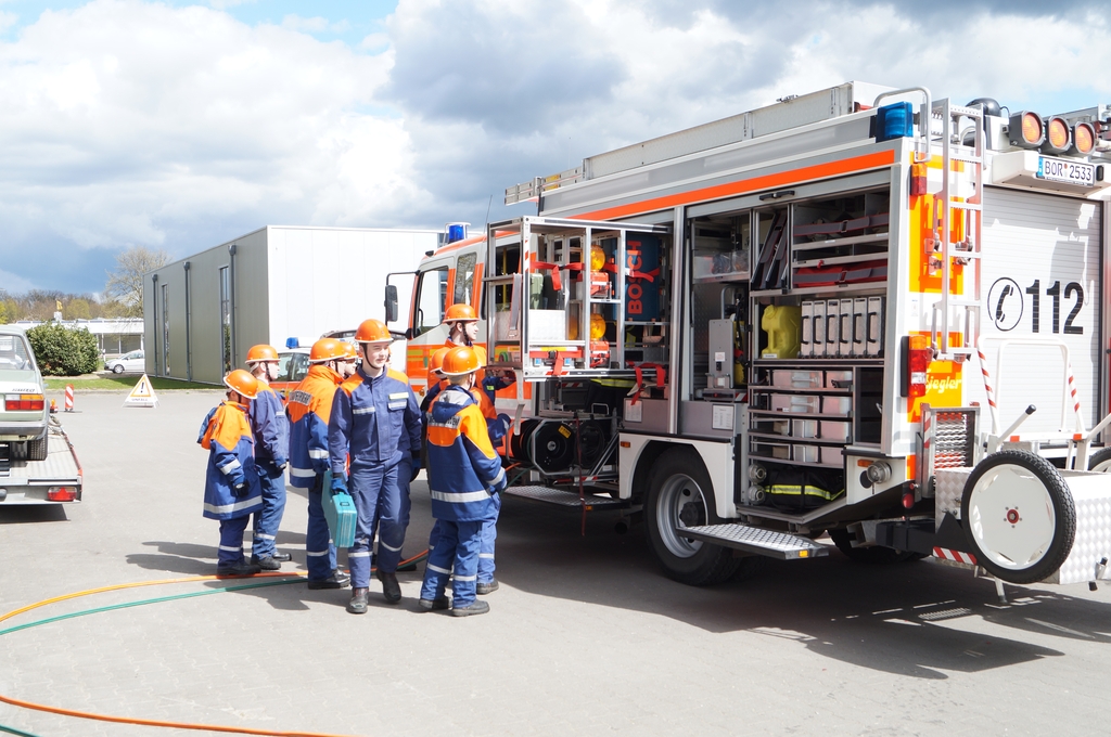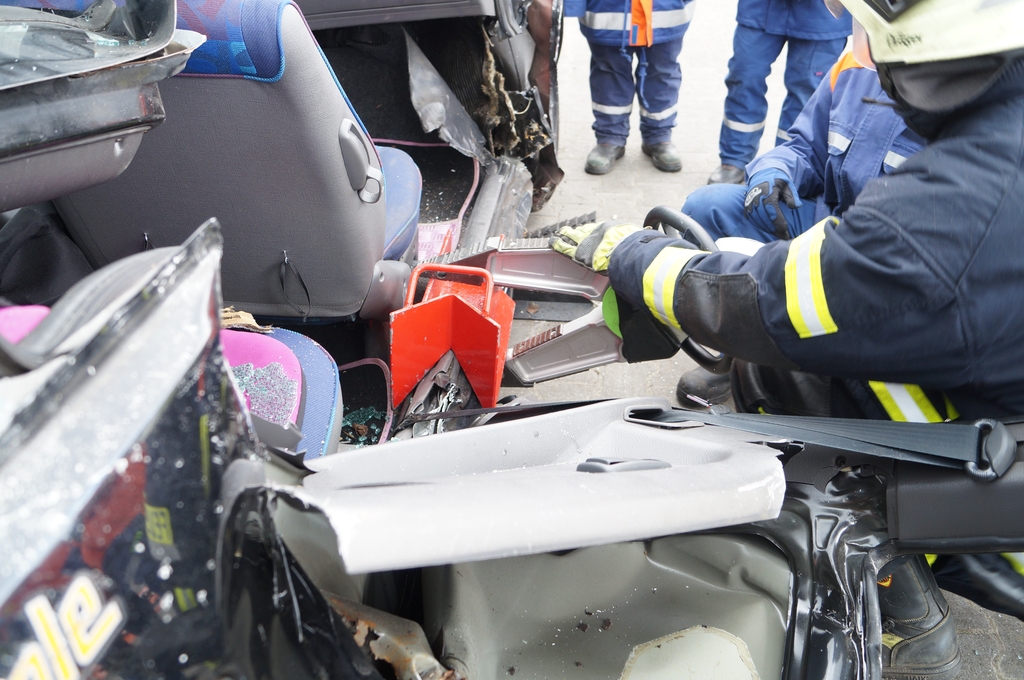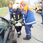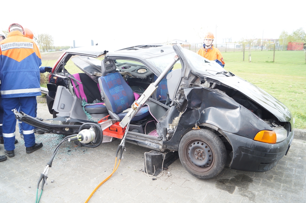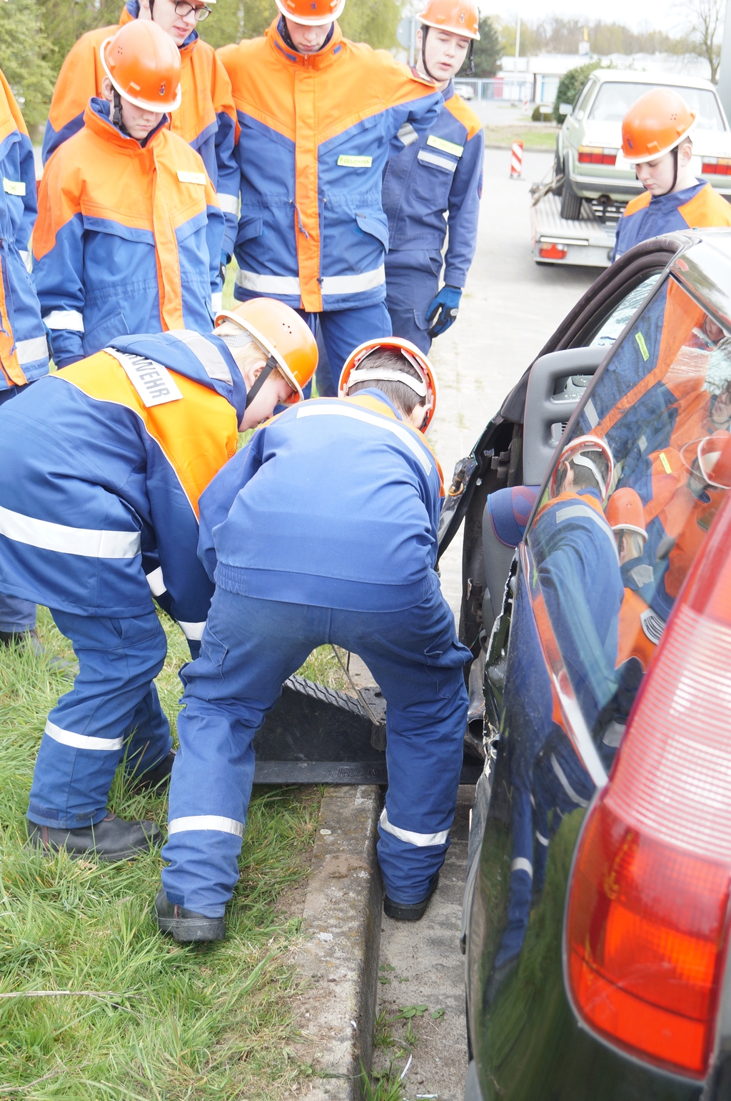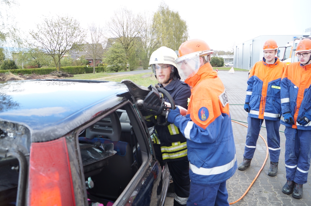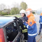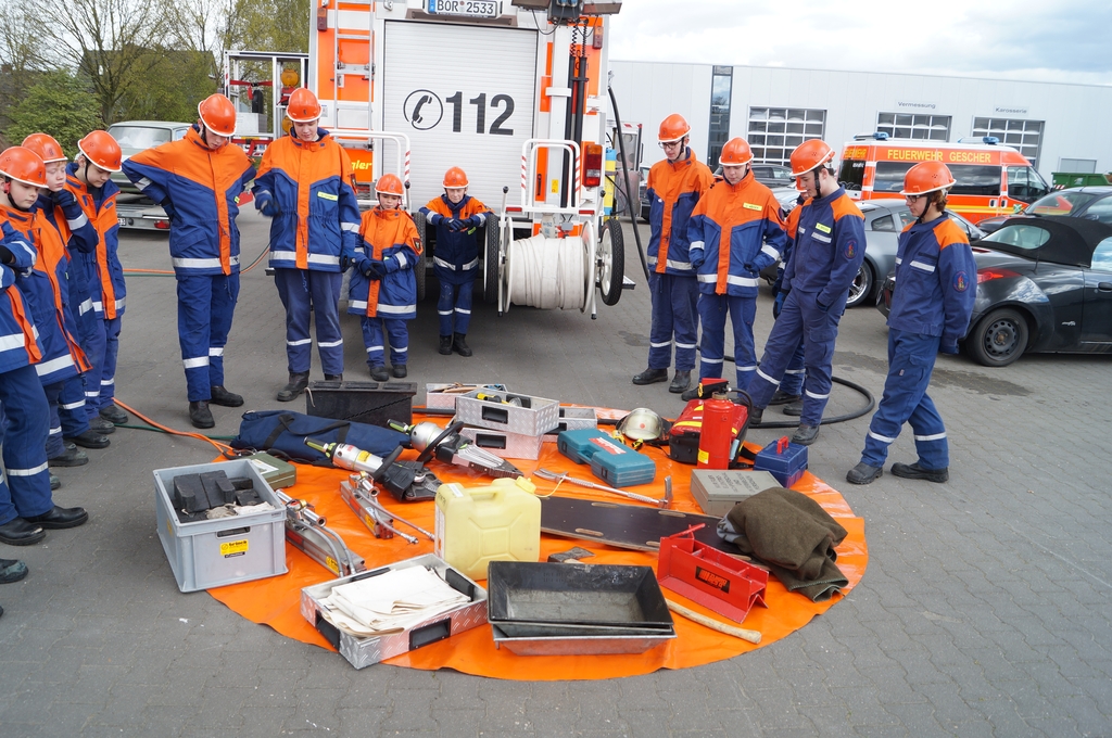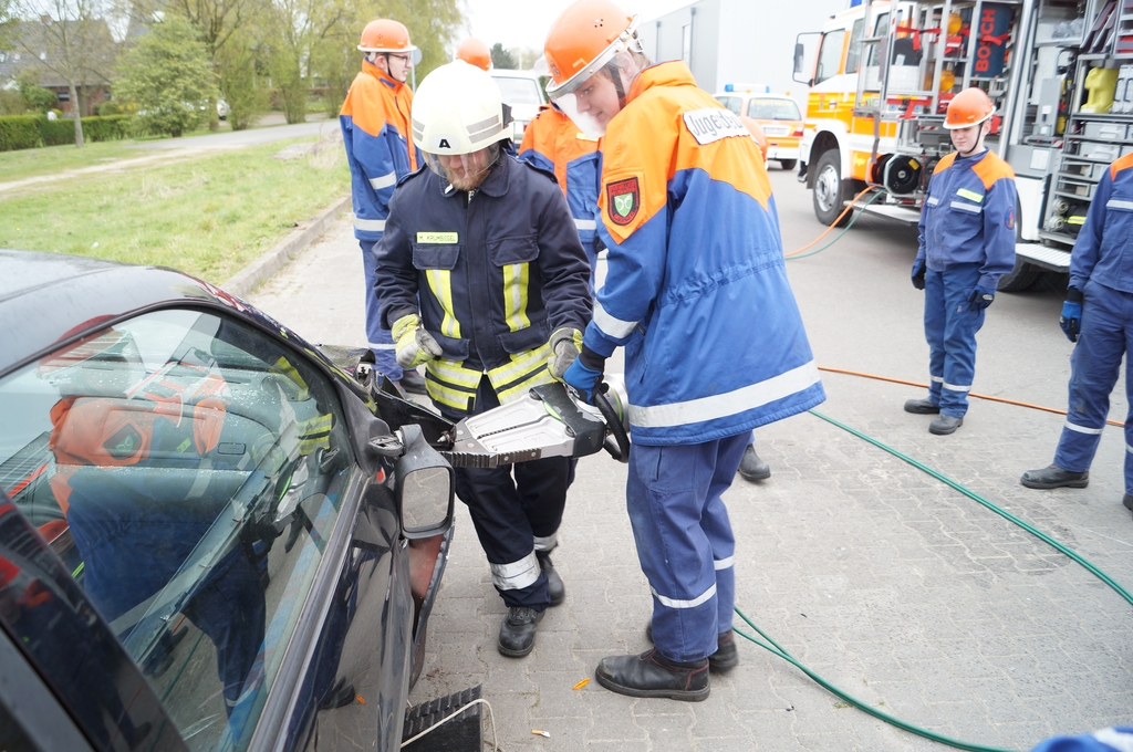 Die Jugendfeuerwehr beschäftigt sich mit allen Tätigkeiten, die eine Feuerwehr erledigt. Dazu gehört neben der Brandbekämpfung auch immer öfter die technische Hilfeleistung. Am vergangenen Samstag hatten die Mitglieder der Jugendfeuerwehr (JFm) Gescher die Gelegenheit mit der Schere und den Spreizer an ein Fahrzeug zu arbeiten. Das aber bei einem Verkehrsunfall viel mehr dazu gehört wie nur diese beiden Geräte erfuhren die JFm zuvor. So musste zuerst die Einsatzstelle abgesichert werden, der Brandschutz sichergestellt werden und alle Geräte zur technischen Hilfeleistung auf der Geräteablage platziert werden. Dann wurden die Geräte kurz erklärt. Anschließend ging es dann ans „Unfallfahrzeug“. Dieses wurde zunächst unterbaut, um Erschütterungen während der Rettung zu minimieren. Dann wurde die Beifahrertür unter Anleitung und mit Unterstützung durch die Jugendwarte fachgerecht entfernt. Im folgenden wurde dann eine größere Öffnung geschaffen, um eine Person auf der Rückbank retten zu können, und dann der Fußraum im Vorderwagen mit Hilfe von hydraulischen Spreizer und Stempel vergrößert. Abschließend durfte jeder JFm noch einmal die Schere am Fahrzeug ansetzen und so die Bedienung des Gerätes üben.
