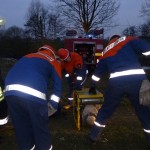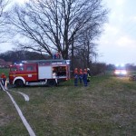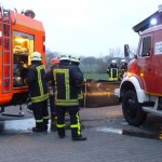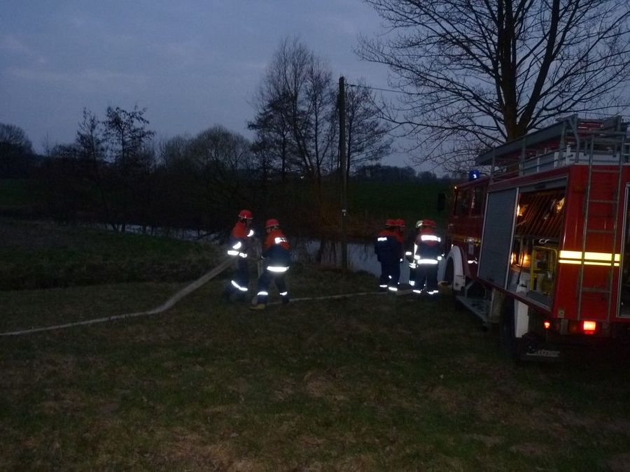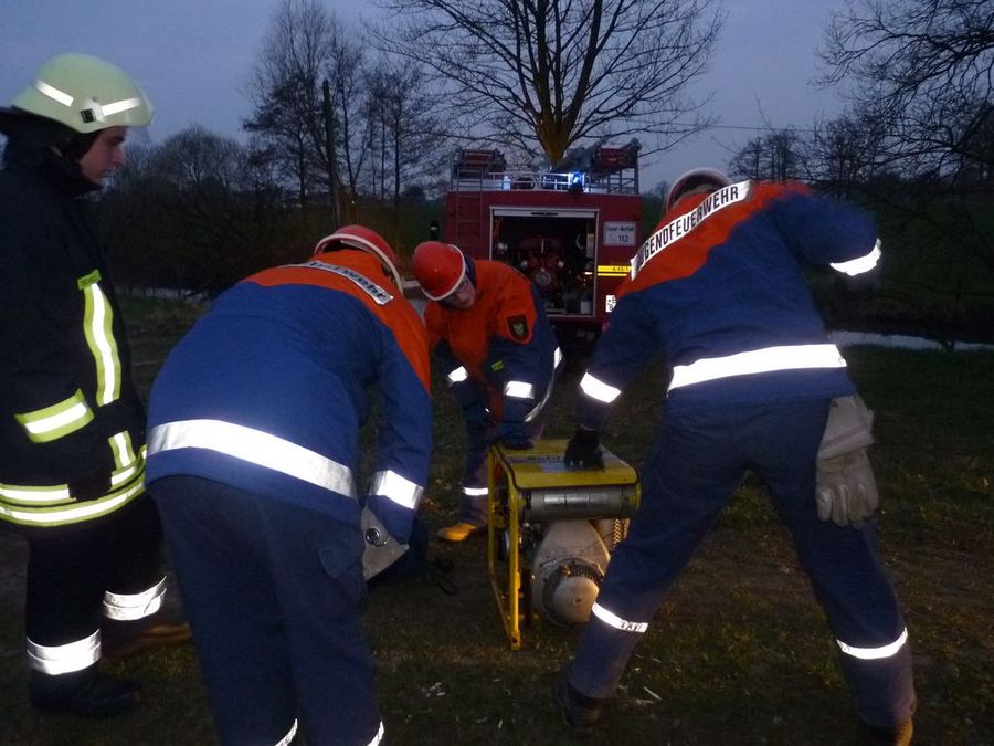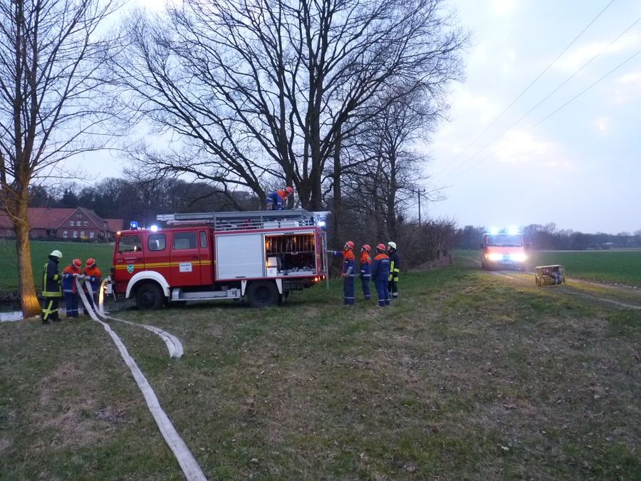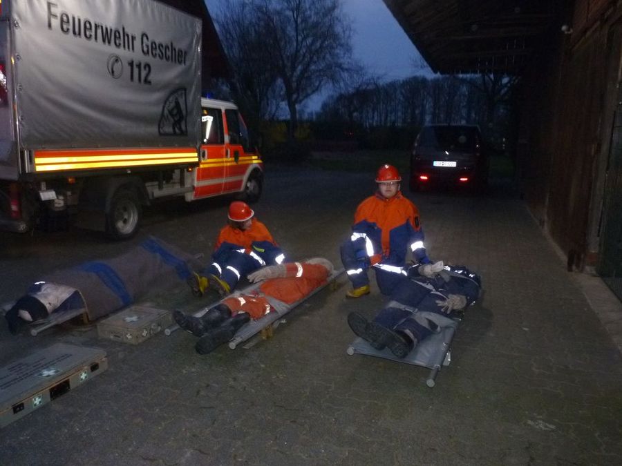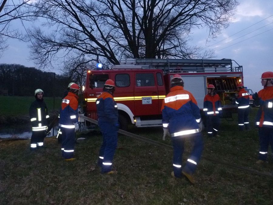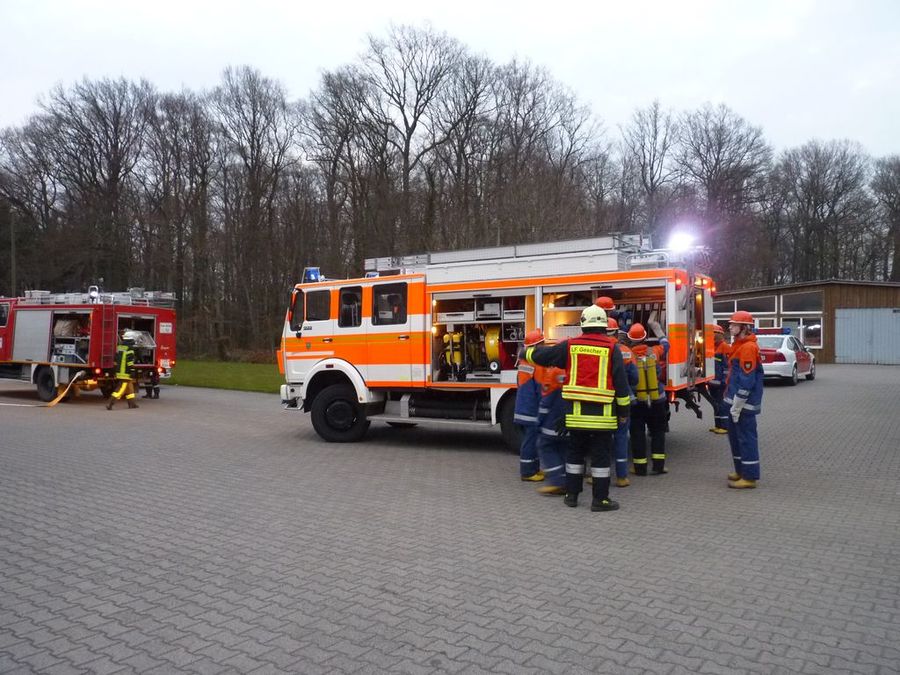 „Feuer in der Schreinerei Roters in Stockum zwischen Coesfeld und Gescher, es werden drei bis vier Personen vermisst“ so lautete das Einsatzstichwort für die erste gemeinsame Übung der Jugendfeuerwehren Coesfeld und Gescher am vergangenem Freitag. Abwechselnd trafen die Einsatzfahrzeuge der Jugendfeuerwehren Coesfeld und Gescher auf dem Gelände der Schreinerei ein. Es wurden Aufgaben wie die Menschenrettung, die Brandbekämpfung und Wasserversorgung verteilt. Dabei spielte es keine Rolle aus welchem Ort die Nachwuchsretter kamen, so wurde z.B. die Menschenrettung gleichzeitig von der verschiedenen Jugendfeuerwehren durchgeführt und auch bei der Wasserversorgung arbeitete man Hand in Hand. So wurde die Pumpe von Gescher in Stellung gebracht, während die 500 m Schlauchleitung von der Berkel zur Einsatzstelle von Coesfeld gezogen wurde, um das Wasser anschließend im Wassersack zu sammeln, der wiederrum von Gescher aufgebaut wurde.  Das die Zusammenarbeit geklappt hat, freute besonders den beiden Jugendwarten Magnus Jankowski und Ralf Beuker, denn man habe bisher noch nie zusammen geübt.